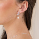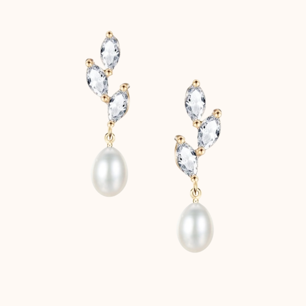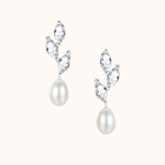 Soft, romantic, and effortlessly elegant - our Layla Pearl Drop Earrings are designed to shine on your most unforgettable moments. Featuring a delicate trio of marquise-cut crystals arranged in a graceful leaf-inspired pattern, each earring is finished with a luminous teardrop pearl that adds timeless bridal sophistication.