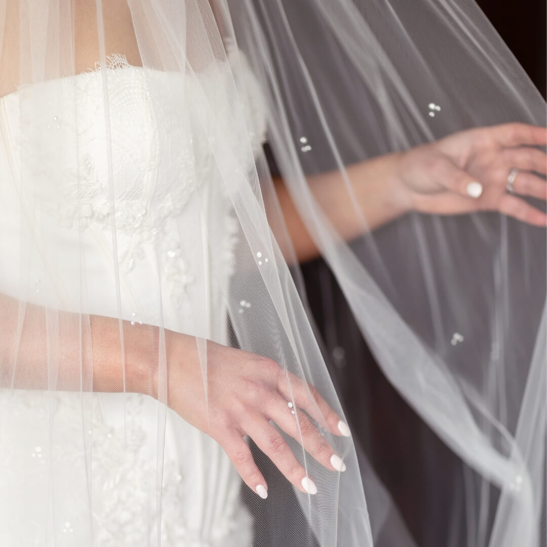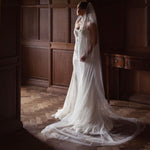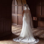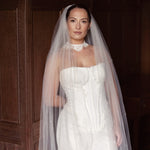 Charlotte is a beautifully soft single tier wedding veil with no blusher and gathered at the comb, designed for brides who love a clean, romantic finish. It drapes in gentle folds, adding movement and softness without distracting from the details of your dress.