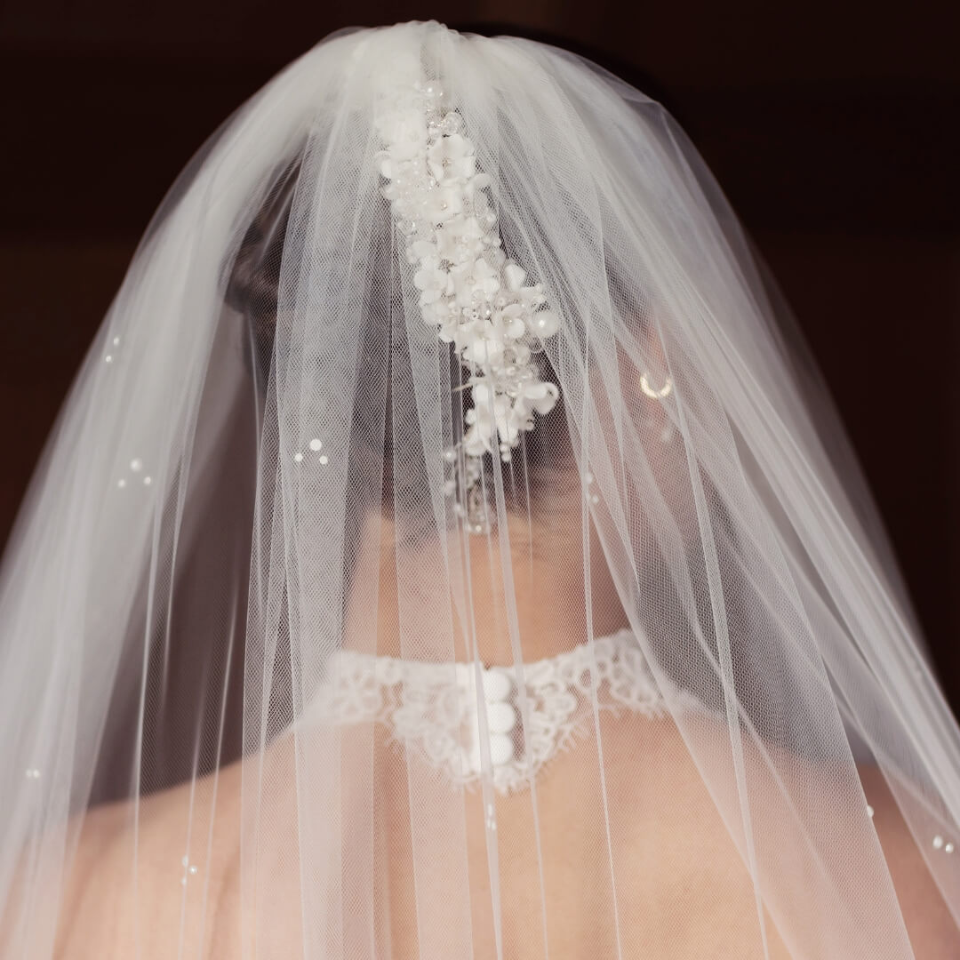 Handmade to order, the Charlotte Veil is crafted from soft Italian tulle and finished as a single tier with no blusher, gathered at the comb for a touch of fullness through the back. The length can be customised to suit your gown and personal style, whether you prefer a shorter, playful look or a sweeping, more traditional veil.