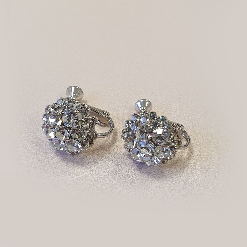 Our stunning Edie earrings feature a round cluster of crystals on an adjustable clip-on setting. Perfect for brides and other bridal party members who don't have pierced ears.