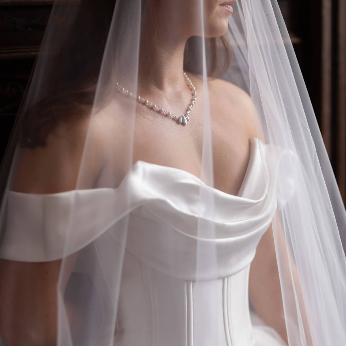 It is a beautiful choice if you’re dreaming of something feminine and refined, with a little extra interest around the collarbone. Ella works wonderfully with classic lace, floral applique and sleek modern gowns alike, and can be tailored to suit both brides and bridesmaids.